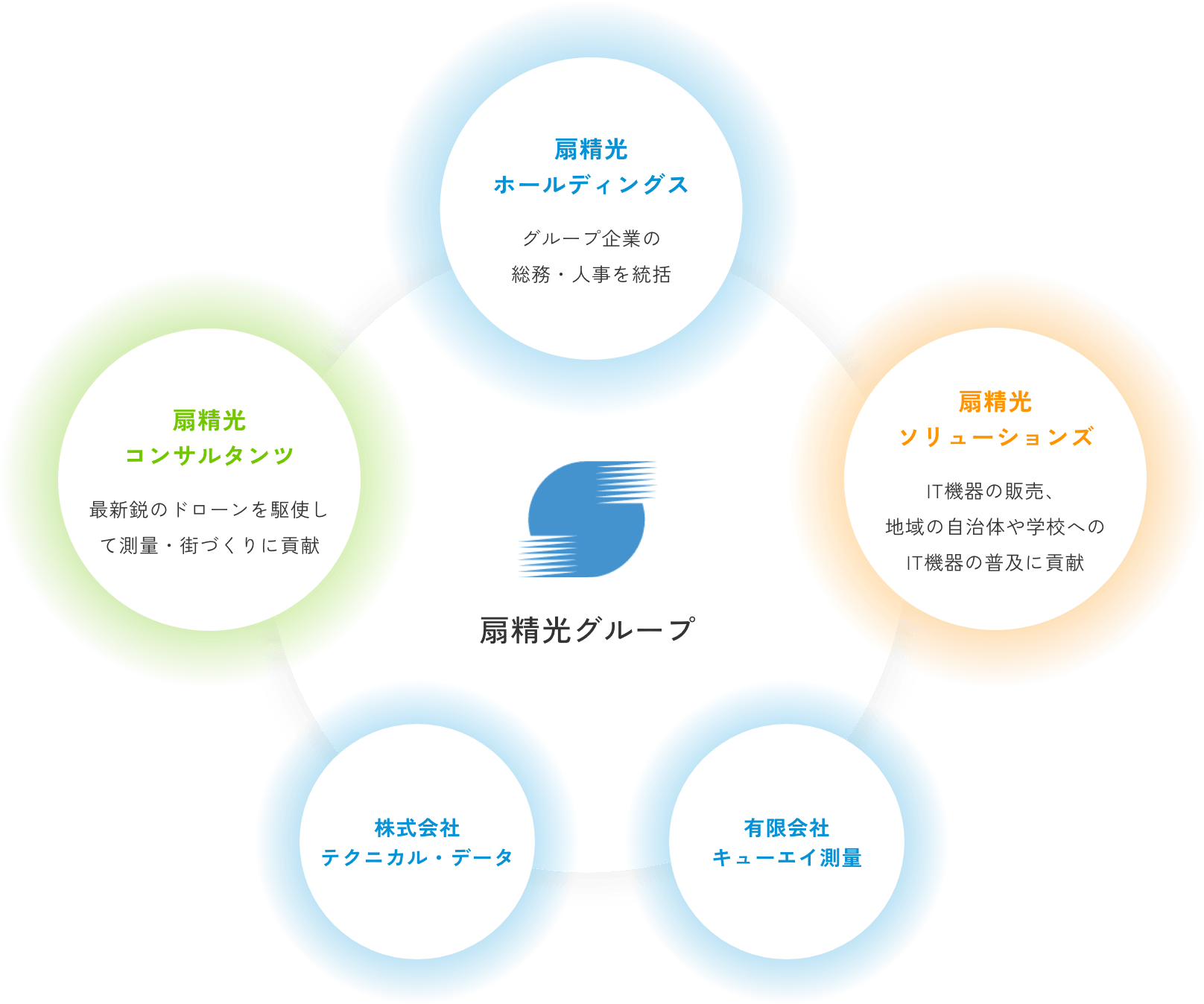 扇精光グループは、建設とITの技術を活かし、地域の街づくりと仕組みづくりを支える技術者集団です。測量・設計からICT機器やシステム開発まで、5つの会社が連携し、地域の今と未来に貢献しています。
